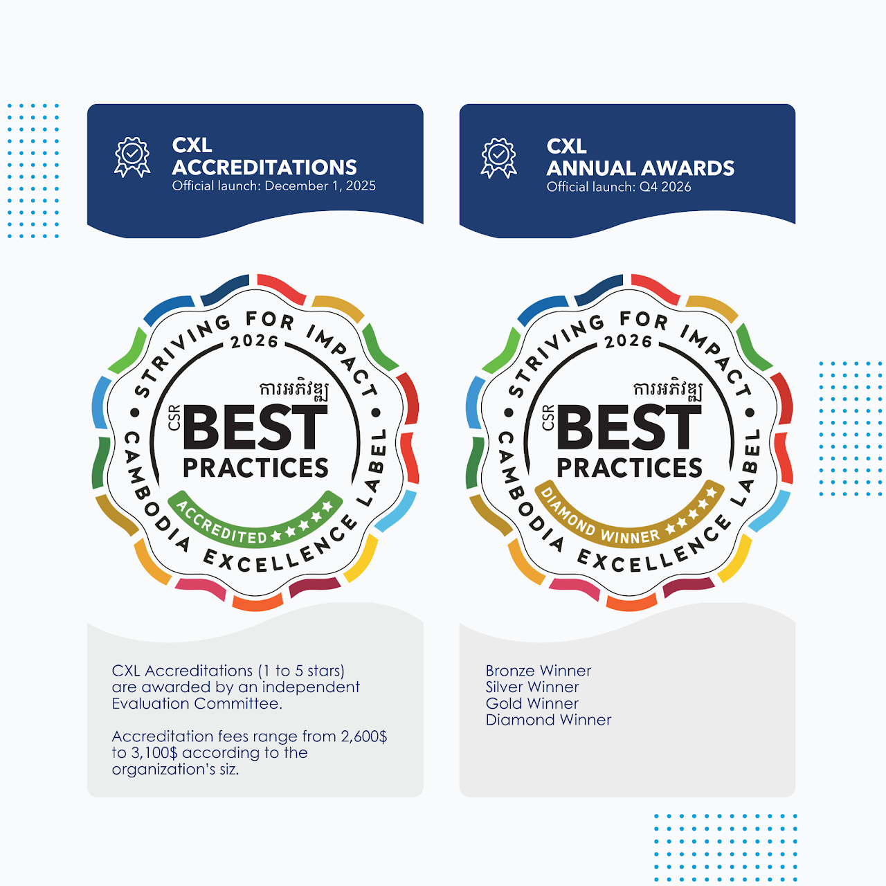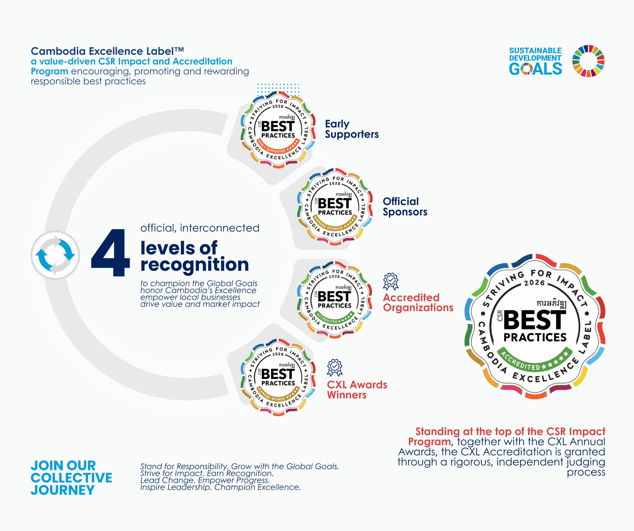 The Cambodia Excellence Label™ (CXL) is a pioneering, value-driven CSR Impact and Accreditation Program committed to advancing the UN Global Goals and their 17 universal targets for the benefit of society as a whole. Its core program is to encourage, promote and reward responsible best practices in Cambodia across the three pillars of sustainable development: economic growth, social equity and environmental stewardship.