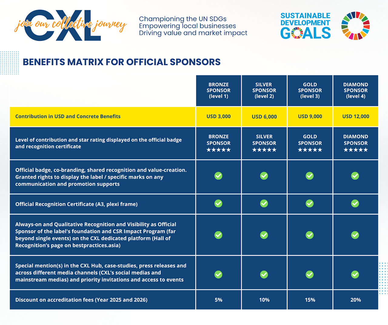 Every Official Sponsor receives the CXL sponsorship certificate, exclusive use of the CXL Official Sponsor badge, and authorization to display the CXL copyrighted marks across all communication and promotional materials. Sponsors are also invited to participate in key events, including the CXL Annual Awards Ceremony, gaining privileged access to a growing network of leaders and innovators shaping the future of responsible business in Cambodia.